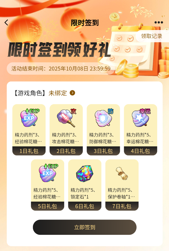 打卡1天获得:经验棉花糖(超级)1、幸运棉花糖(超级)1、中阶强化药水*4