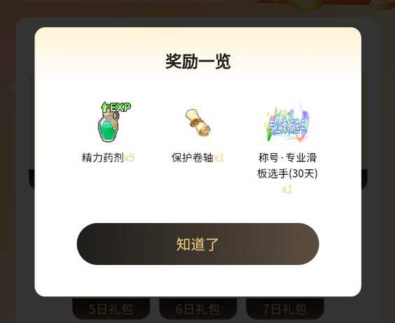 打卡3天获得:精力药剂*5、装备+7随机券*1、经验棉花糖(超级)*1、金币*200000